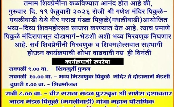 पिकुळे (मधलीवाडी) येथे १९ फेब्रुवारीला भव्य शिवमहोत्सव; मिरवणूक व दशावतार नाट्य प्रयोगाचे आयोजन..
