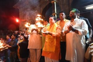 : भगवा कुर्ता पेहराव परिधान केलेल्या हिंदुत्ववादी नेते मंत्री नितेशजी राणे यांच्या हस्ते पवित्र गंगेच्या तीरी महाआरती करण्यात आली.
