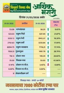 सिंधुदुर्ग जिल्हा मध्यवर्ती सहकारी बँकेने आर्थिक वर्ष २०२५-२६ मध्ये अत्यंत चमकदार कामगिरी केली असून, बँकेने ७००० कोटी रुपयांच्या एकूण व्यवसायाचा ऐतिहासिक टप्पा पार केला आहे. ३१ मार्च २०२६ अखेर संपलेल्या आर्थिक वर्षात बँकेने सर्वच क्षेत्रांत भरीव वाढ नोंदवत आपला दबदबा कायम राखला आहे. बँकेच्या या यशाबद्दल अध्यक्ष मा. श्री. मनीष दळवी यांनी सर्व ठेवीदार, कर्जदार, ग्राहक आणि हितचिंतकांचे मनःपूर्वक आभार मानले आहेत.